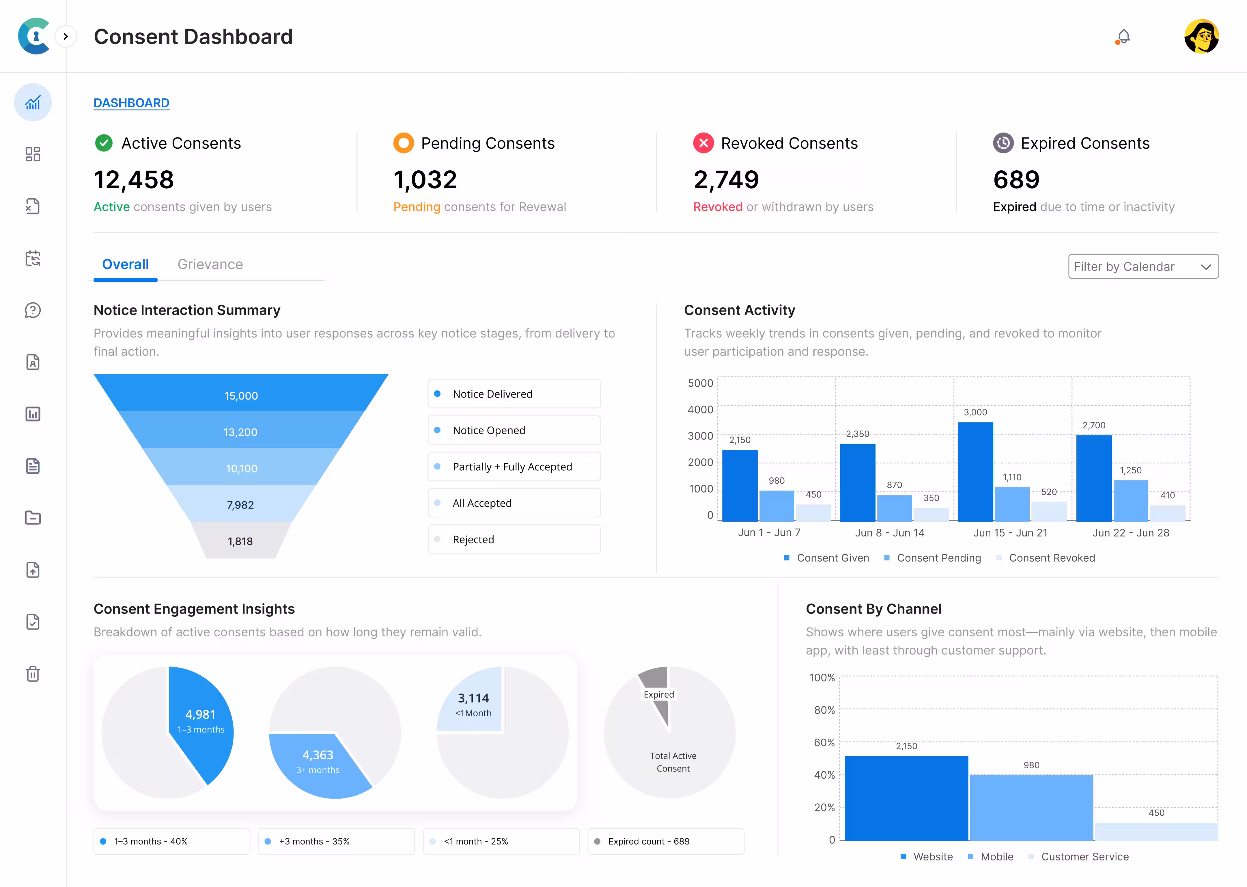 Generate one click reports, track downstream data sharing & manage every consent action, and stay regulator ready with seamless compliance visibility through multiple dashboards.